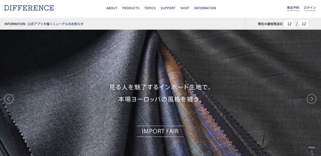 DIFFERENCEは、コナカグループが運営するオーダースーツ専門店で、最新テクノロジーと伝統的なテーラリング技術を融合させた革新的なサービスを提供しています。最大の特徴は、AI画像採寸アプリを活用することで、自宅からでも正確な採寸が可能な点です。一度店舗で採寸すれば、2回目以降はスマホアプリから簡単にオーダーでき、忙しいビジネスパーソンに最適です。佐藤可士和氏が監修したブランドデザインで、全国66店舗を展開しています。最短2週間での納品が可能で、急ぎでスーツが必要な方にもおすすめです。ブランド独自の型紙を保有し、トレンドを取り入れた高品質なオーダースーツを提供しています。