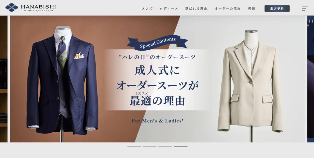 - HANABISHIは、長年の実績と国内自社工場による確かな品質を求める方におすすめです。1935年創業の老舗ならではの技術力で、丁寧な仕立てにこだわっています。ブリティッシュ、イタリアン、インターナショナルの3つのスタイルから選べるため、クラシックな英国調からゆったりとしたイタリアン調まで、好みに合わせたシルエットを実現できます。全国43店舗展開で、2回目以降は採寸不要なため、出張が多いビジネスパーソンにも便利です。