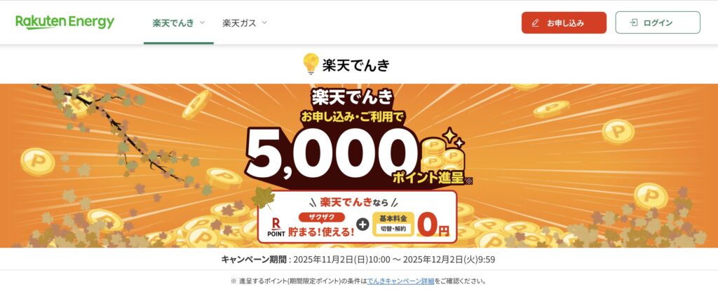 新規契約で最大5,000ポイントの楽天ポイントがもらえるキャンペーンを実施中です。楽天ガスとセットで契約すると電気料金が割引されます。