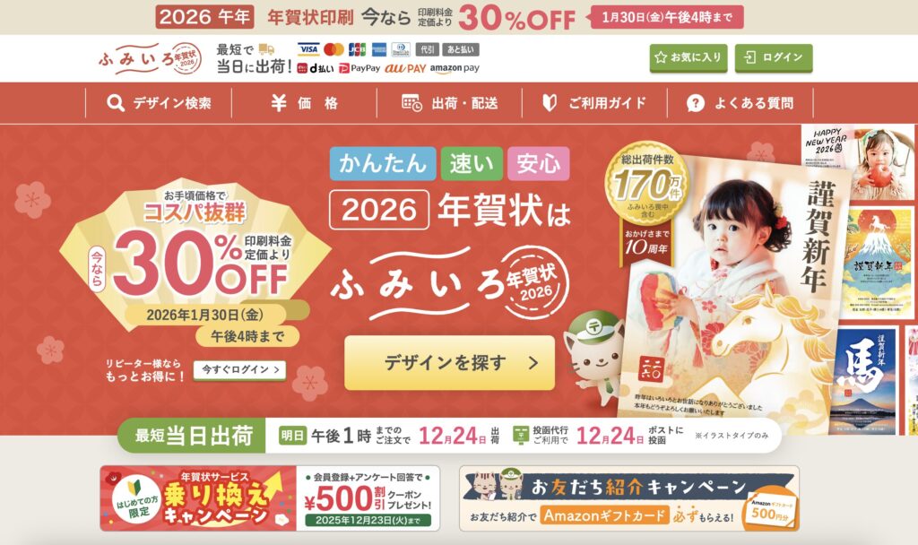- ふみいろ年賀状は、年末が忙しく時間がない方、宛名書きや投函の手間を省きたい方、写真入り年賀状を作りたいファミリー層におすすめです。最短当日出荷と充実した無料サービスで、安心してお任せできる年賀状印刷サービスです。