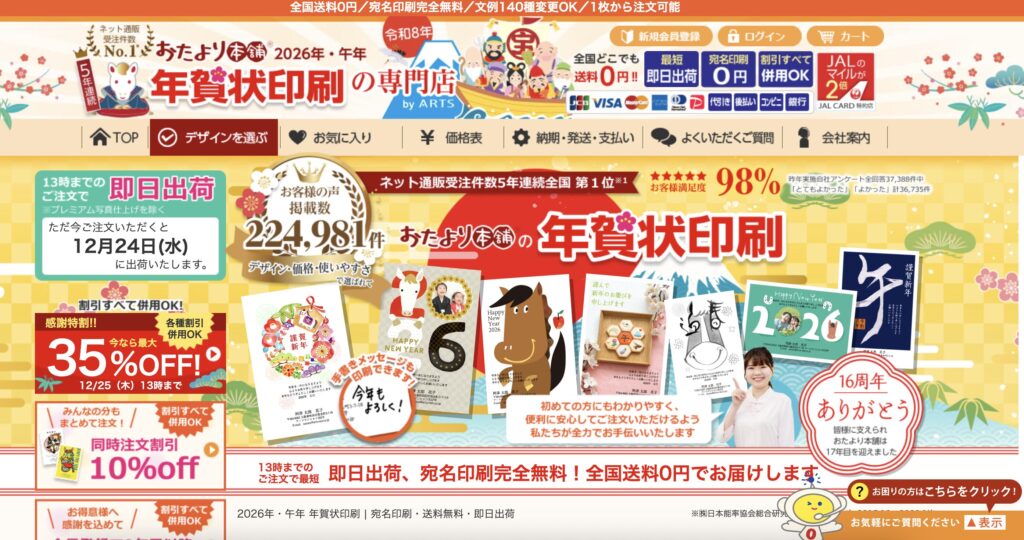 おたより本舗は、2026年午年の年賀状印刷サービスとして、16周年を迎える老舗の印刷専門店です。デザインは870種類以上を用意し、38名の年賀状作家さんのオリジナルデザインも豊富に取り揃えています。過去に2億308万枚のはがきを印刷してきた実績があり、高品質かつ適正価格での提供を使命としています。印刷から出荷、ホームページ、システム開発まで社内一貫体制で大幅なコストダウンを実現しており、店舗や営業を置かないネット注文だからこそ低価格を実現しています。